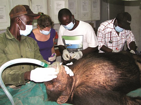 | Soin d’un primate dans un centre de prise en charge des animaux rescapés des braconniers au Cameroun. |