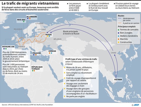 | Carte montrant les routes du trafic humain du Vietnam vers l'Europe, le profil type des migrants et leurs principaux emplois. |