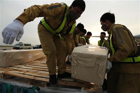 | Des employés de l'aéroport international de Nôi Bài (Hanoï) transporte les corps des victimes dans des voitures pour les ramener à la maison. |