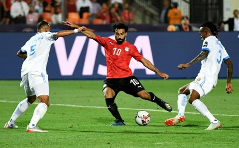 | L'Égyptien Mohamed Salah (centre) tire et marque contre la RD du Congo à la CAN, le 26 juin au Caire. |