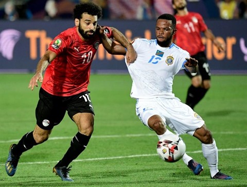 | Mohamed Salah (gauche) à la lutte avec le Congolais, Elia Meschak, à la CAN, le 26 juin au Caire. |