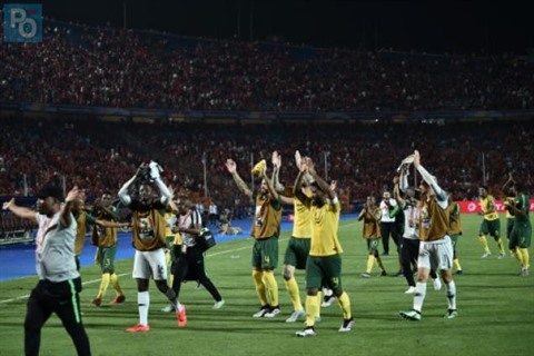 | Les joueurs de l'Afrique du Sud fêtent leur victoire sur l'Egypte en 8e de finale de la CAN au Caire le 6 juillet. |