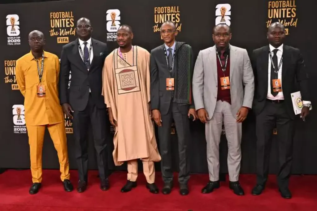| Les président et vice-président de la fédération sénégalaise de football, ainsi que le sélectionneur de l'équipe nationale Pape Thiaw (centre gauche) le 5 décembre 2025 à Washington DC. |