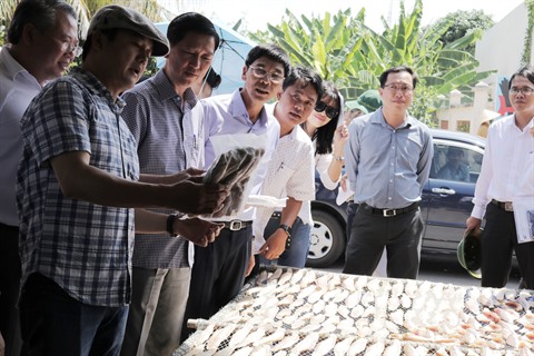 | Les dirigeants de Hô Chi Minh-Ville visitent le 18 février un établissement de transformation de pangasius kunyit, poisson qui est séché. |