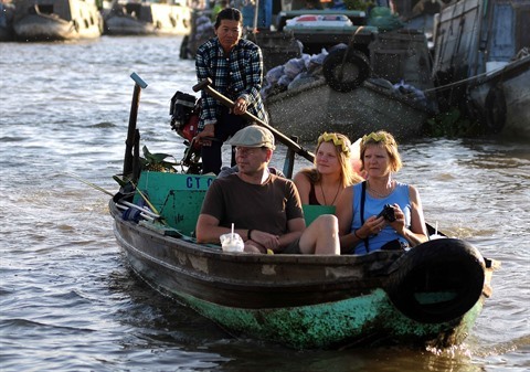 | Les touristes étrangers visitent le marché flottant Cai Rang, à Cân Tho. |