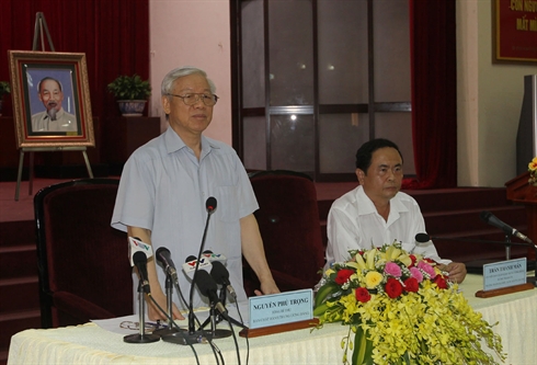 | Le secrétaire général du Parti communiste vietnamien Nguyên Phu Trong (debout), lors de la séance de travail 14 août à Cân Tho. |