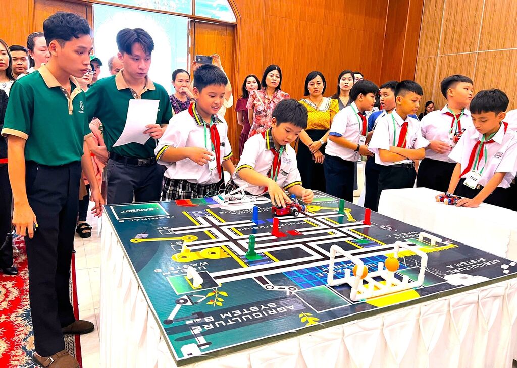 | Des élèves à Cân Tho participent à des concours de programmation robotique entièrement en anglais. |