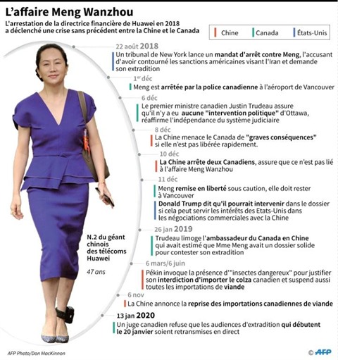 | Principaux développements depuis l'arrestation au Canada en décembre 2018 de la No2 du géant des télécoms chinois Huawei. |