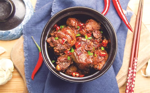 - Dans une poêle à bord haut, faire revenir le canard avec les rondelles de gingembre, 3 cuillères à soupe (c.à.s) de sauce soja noire et un filet d’huile.