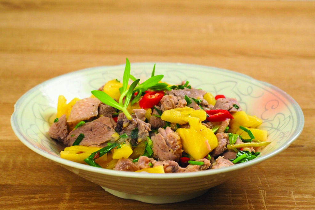 - Faites sauter jusqu’à ce que la viande soit bien cuite puis ajoutez l’ananas. Mélangez bien et assaisonnez selon votre goût.