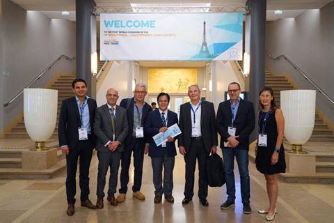 | Des médecins de l’HUMP et leurs collègues étrangers, lors du 1er Congrès mondial de la Société internationale du foie laparoscopique, qui s'est tenu du 6 au 8 juillet 2017 à Paris. |