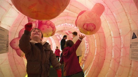 | Des enfants jouent avec des polypes, le 3 avril 2010 à Lyon, dans une maquette géante d'intestin pour les sensibiliser au dépistage du cancer colorectal. |
