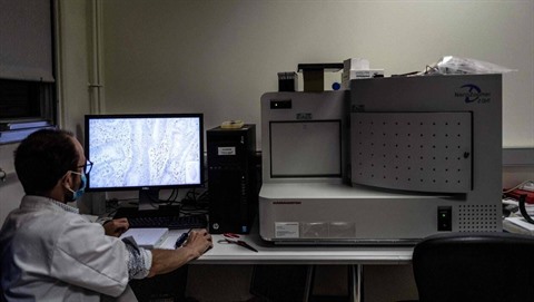 | Analyse d'une tumeur au centre Centre de lutte contre le cancer Georges-François Leclerc de Dijon (CGFL), le 2 septembre. |