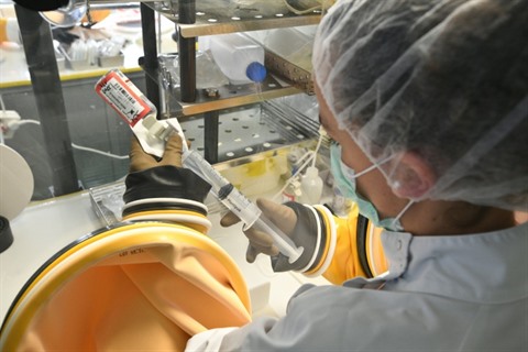 | Préparation d'une chimiothérapie, dans un laboratoire de La Rochelle, le 17 mars. |
