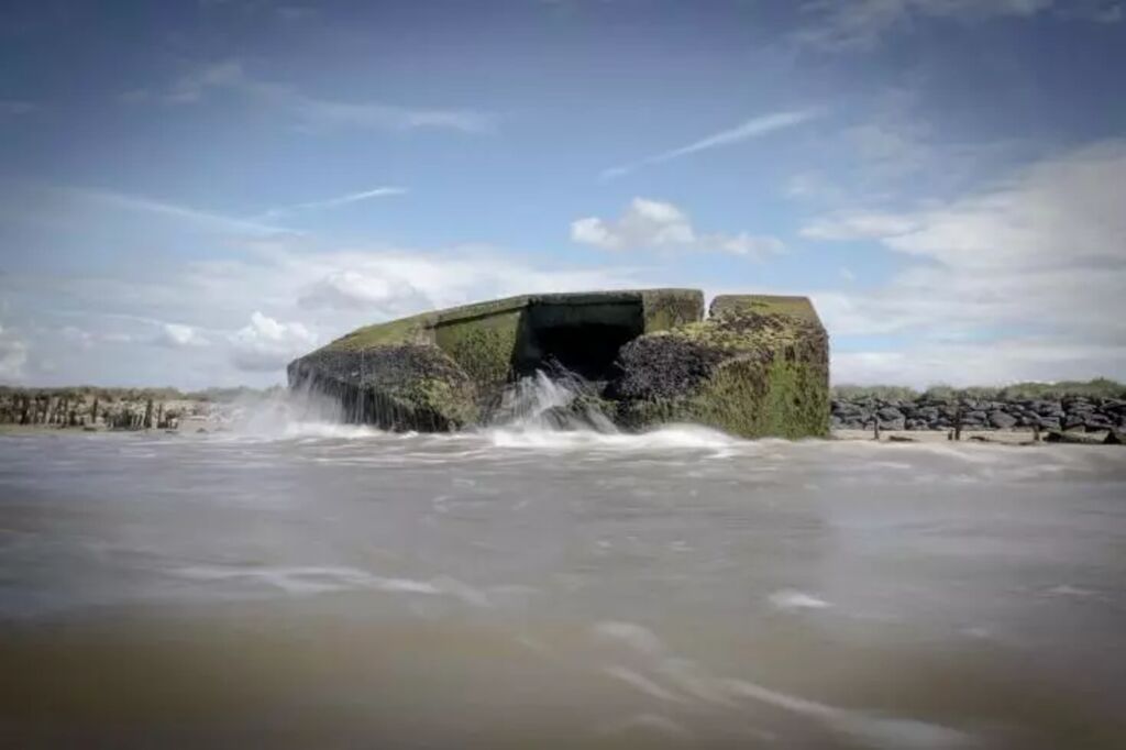 | Un bunker partiellement submergé du Mur de l'Atlantique, près d'Asnelles, en Normandie, le 16 mai 2024, qui a reçu le nom de code "Juno Beach" lors du débarquement allié du jour J en 1944. |