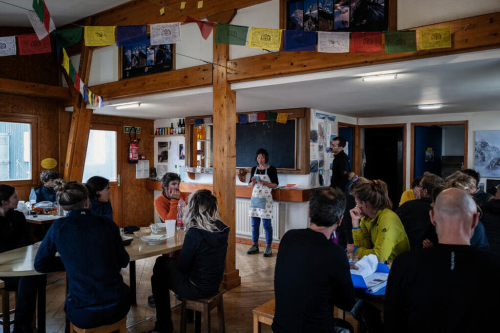 | La gardienbe du refuge de la Selle annonce la météo des prochains jours aux alpinistes à la fin du dîner dans le massif des Écrins, à Saint-Christophe-en-Oisans, le 8 juillet. |
