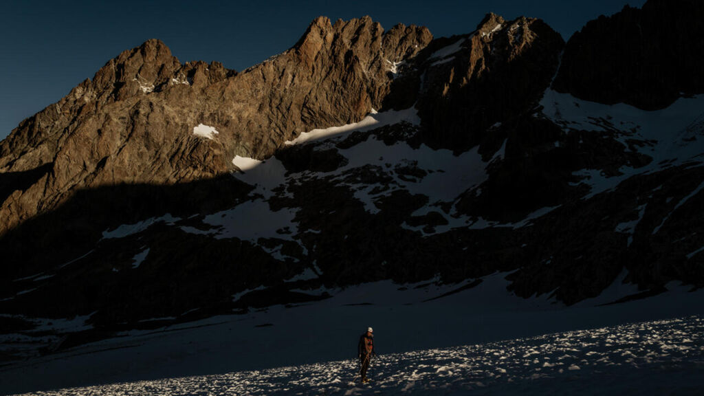 | Un alpiniste sur le Glacier de la Selle tôt le matin, dans le massif des Ecrins, le 9 juillet à Saint-Christophe-en-Oisans, en Isère. |