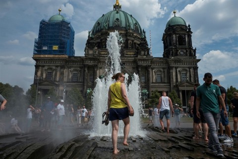 | Des visiteurs se rafraïchissent dans la fontaine de la cathédrale de Berlin, le 4 août. |