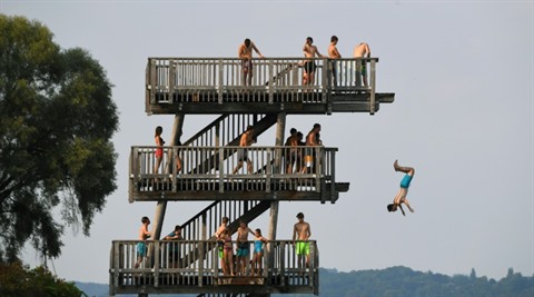 | Des nageurs font la queue pour plonger dans une piscine à Utting am Ammersee, en Allemagne, le 4 août. |