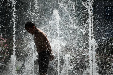 | Un enfant se rafraîchit dans des jeux d'eau au parc André Citroën à Paris le 23 juillet. |