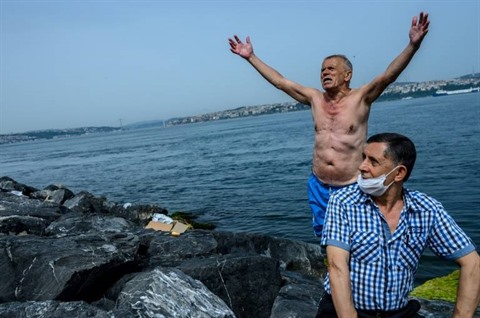 Des dizaines de millions de Turcs sont ces jours-ci sous un confinement strict, à l'exception des plus de 65 ans, qui ont pu sortir dimanche selon des horaires réaménagés du fait de la chaleur. À Istanbul, certains en ont profité pour se rafraîchir dans les eaux du Bosphore.
