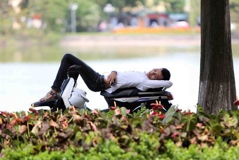 | Un moto-taxi fait sa sieste, le 5 juin, dans la rue Nguyên Công Tru, à Hanoï. |