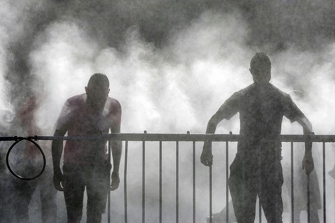 | Des habitants se rafraîchissent sur une place du centre-ville de Strasbourg, le 28 juin. |
