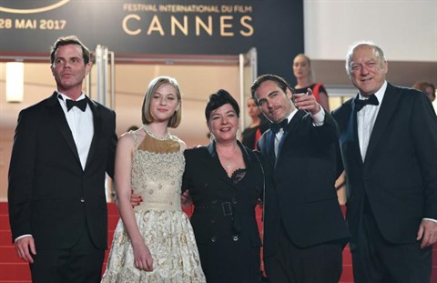 | De gauche à droite : l'acteur américain Alex Manette, l'actrice russo-americaine Ekaterina Samsonov, la réalisatrice britannique Lynne Ramsay, les acteurs américains Joaquin Phoenix et John Doman, lors de la présentation du film "You were never really here", le 27 mai au Festival de Cannes |