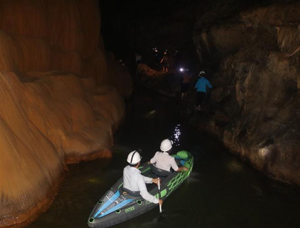 | Touristes découvrant la grotte Nguom Ngao à Cao Bang. |
