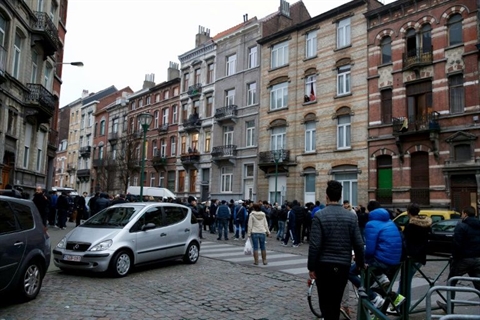 | Des habitants de Molenbeek s'attardent le 19 mars devant la rue où Salah Abdeslam a été arrêté la veille. |
