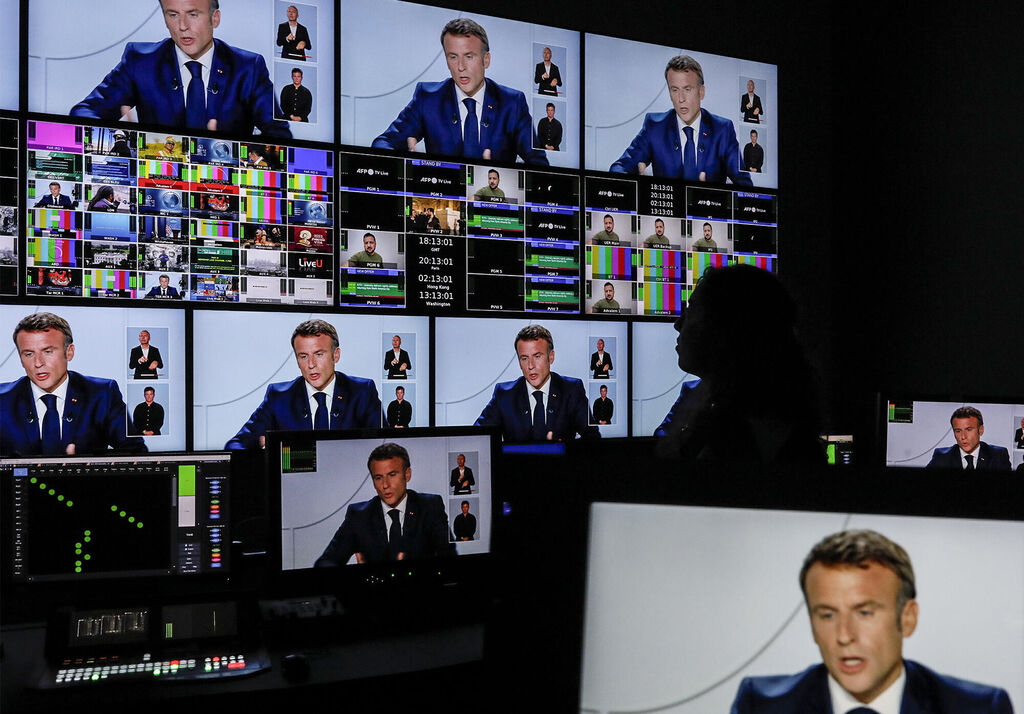 | Des écrans de contrôle au siège de l'AFP à Paris lors de l'intervention télévisée d'Emmanuel Macron le 24 septembre. |