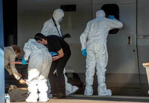 | La police scientifique examine le train Thalys, le 22 août en gare d'Arras. |