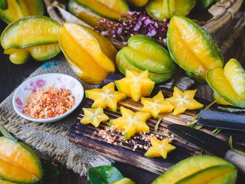 La carambole est le fruit exotique du carambolier. Le fruit est mangé avec du sel ou comme légume. Il est particulièrement riche en acide ascorbique. En France, je l’avais déjà beaucoup vu dans les assiettes que certains restaurateurs décorent avec plus ou moins de bonheur, en découpant les fruits en tranches étoilées.