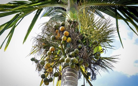 Palmier au tronc frêle terminé par une houppe de palmes. La noix d’arec est utilisée pour la chique de bétel. À chaque fois que j’en vois un, je pense à l’histoire que l’on m’a racontée: une jeune femme aimée par deux frères, qui se sont tous transformés en arbre, pierre et liane. C’est un empereur qui a exigé qu’à chaque invitation, on offre aux invités une noix d’arec, avec une feuille de bétel et un peu de chaux pour se rappeler l’amour conjugal et l’amour filial. Belle histoire! Mais, mon palais a bien du mal à accepter le goût de cette noix d’arec.
