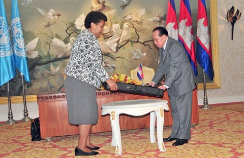 | Le vice-PM Hor Namhong (droite) retourne les 18 pièces des cartes originales du Cambodge à la présidente p.i. de la Bibliothèque Dag Hammarskjöld de l’ONU, Mereani Keleti Vakasisikakala, le 26 août à Phnom Penh. |