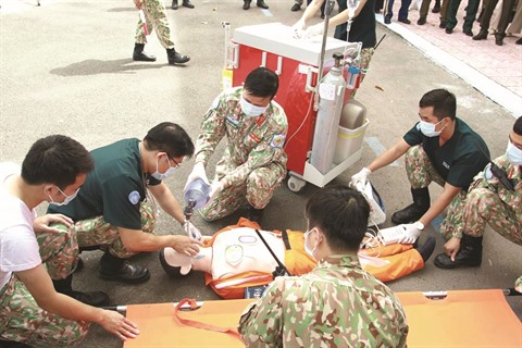 | Casques bleus vietnamiens lors d’un cours de perfectionnement sur les premiers secours avant leur départ pour le Soudan du Sud. |