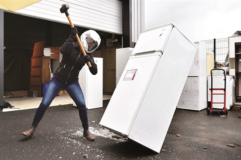 | Une personne détruit un réfrigérateur avec un marteau à Noyal-Chatillon-sur-Seiche, dans l’Ouest de la France. |