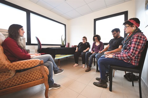 | La sophrologiste Jennifer Le Guen (gauche) et ses apprentis dans une séance de relaxation à Noyal-Chatillon-sur-Seiches, en France. |