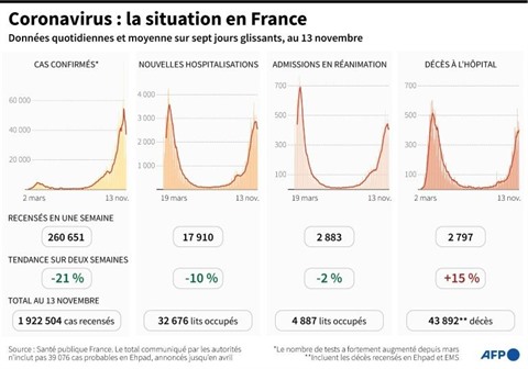 Le principal syndicat des métiers de l'hôtellerie, l'Umih, a en outre annoncé son intention de contester la fermeture des restaurants et des cafés devant le Conseil d'État.Le nombre de morts en France atteint un total de 44.246 depuis le début de la pandémie. Le nombre de patients atteints du COVID-19 actuellement en réanimation, 4.855 personnes, est en légère baisse cependant, selon les derniers chiffres publiés par Santé publique France samedi 14 novembre.