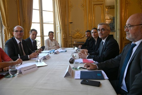 | Table de négociations avec le Premier ministre Jean Castex (gauche) et les partenaires sociaux à Matignon, le 9 juillet 2020. |