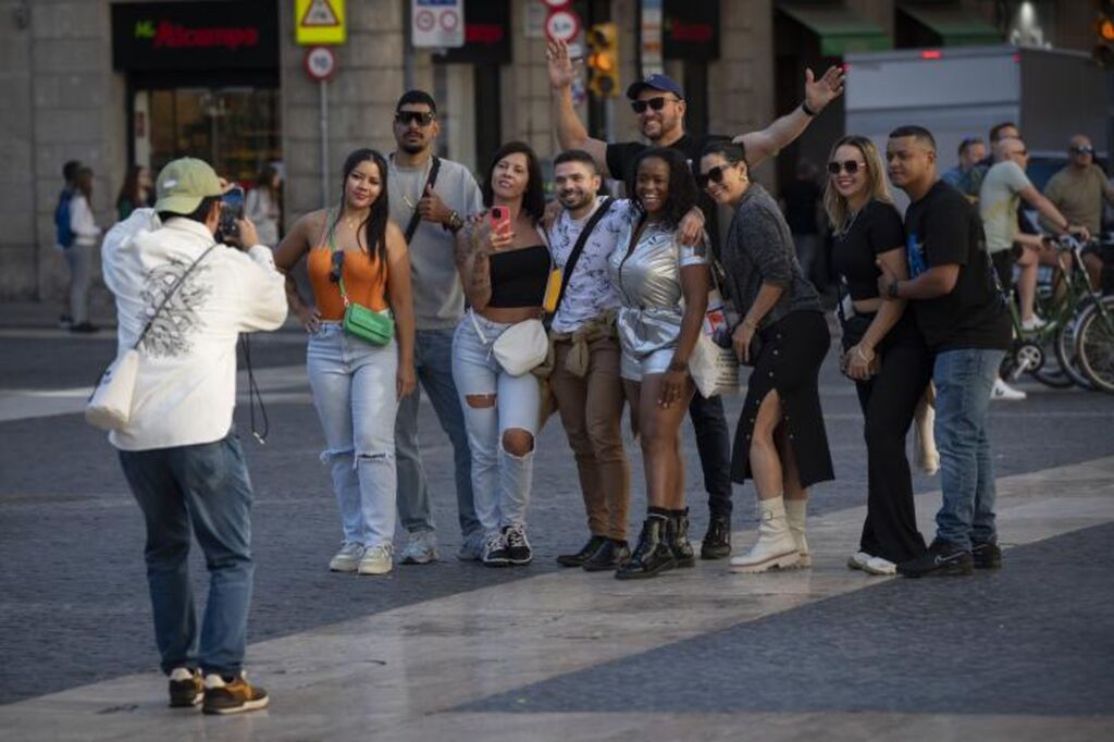 | Des touristes prennent la pose pour une photo, le 4 octobre à Barcelone (Espagne). |