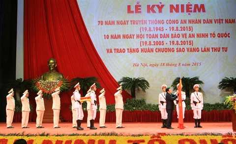 | Le président de la République, Truong Tân Sang, remet l’Ordre de l’Étoile d’or (4e fois) aux forces de la Police populaire du Vietnam, le 18 août à Hanoi. |