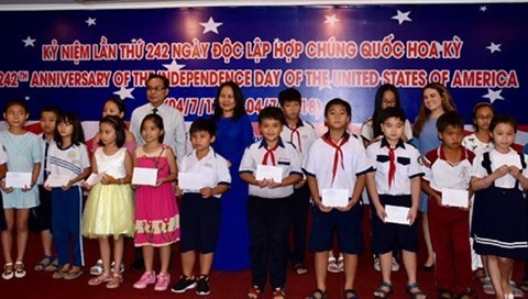 | Remise de bourses d'études à des élèves démunis à l'occasion de la célébration du 242e anniversaire du l'indépendance des États-Unis à Hô Chi Minh-Ville. |