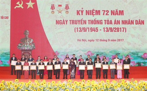 Le 13 septembre 1945, le Président Hô Chi Minh a signé un décret sur la création de tribunaux militaires afin de défendre le régime démocratique populaire. Cette date est ainsi devenue la Journée traditionnelle du Tribunal populaire du Vietnam. Ces 72 dernières années, les tribunaux de tous niveaux n’ont cessé de se développer et d’améliorer leurs activités afin de défendre la justice, les droits de l’Homme, le régime socialiste, ainsi que les droits et intérêts légitimes des organisations et particuliers.