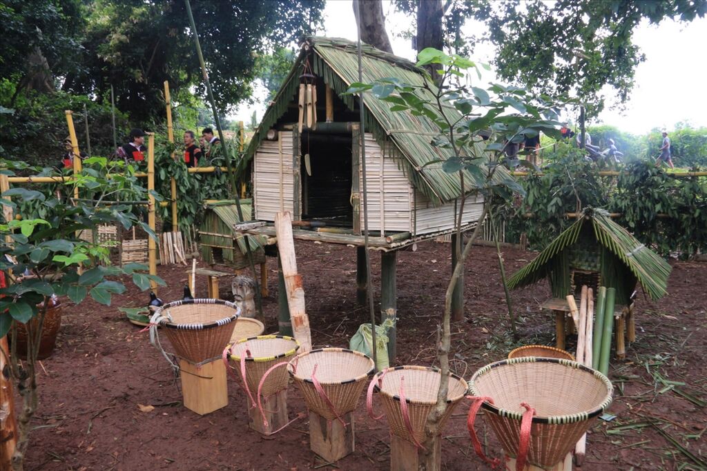 | Les Ê dê construisent des maisons sur pilotis, des greniers et exposent des objets dans la zone de culte No du. |