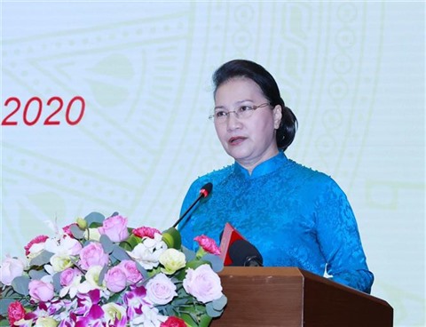 | La présidente de l'Assemblée nationale, Nguyên Thi Kim Ngân, prend sa parole à la cérémonie de célébration des 75 ans du Congrès des représentants du peuple de Tân Trào, le 19 août à Hanoï. |