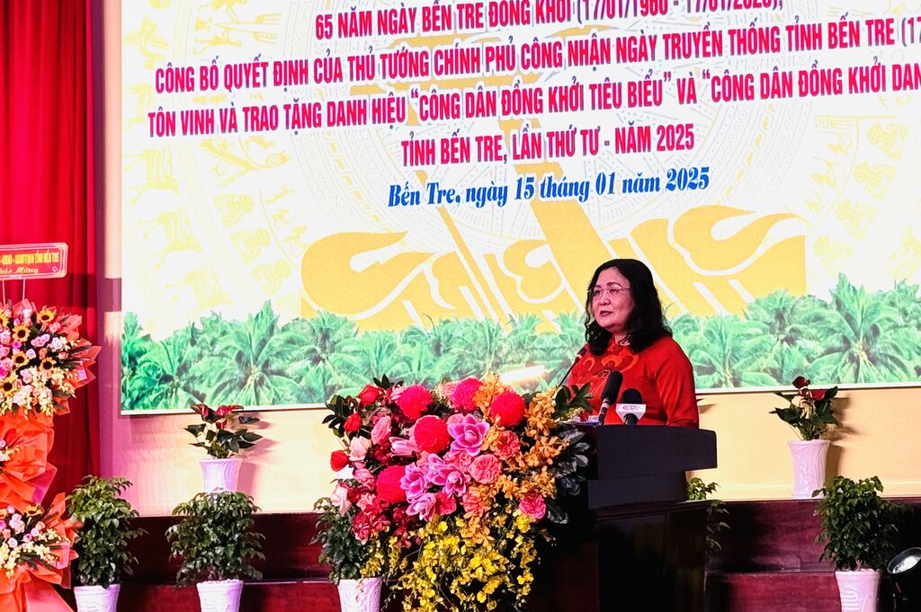 Hô Thi Hoàng Yên a également souligné qu’"en particulier, le 27 novembre 2024, le Premier ministre a décidé de faire du 17 janvier de chaque année la Journée traditionnelle de la province de Bên Tre. Cette décision réaffirme l’importance historique du mouvement de Dông Khoi, qui a marqué l’histoire de la province en 1960. C’est une reconnaissance officielle de Bên Tre comme la patrie du mouvement de Dông Khoi au Vietnam, contribuant à faire comprendre à tous, et surtout aux jeunes générations, les traditions historiques de la province. Cette journée rappelle les exploits glorieux, les figures héroïques et les sites historiques, devenus au fil des ans des symboles du patriotisme et de l’esprit indomptable de l’armée et du peuple de Bên Tre."