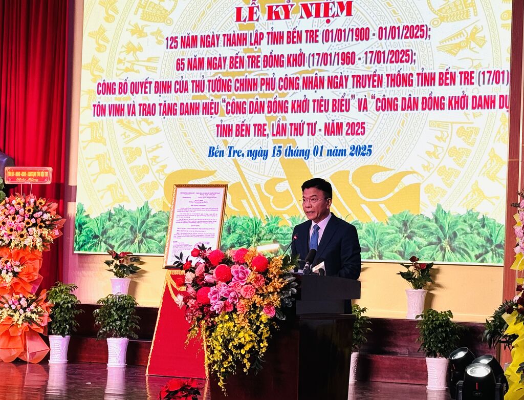 Lors de la cérémonie, le Comité populaire de la province de Bên Tre a officiellement rappelé la création de Bên Tre le 1er janvier 1900 et annoncé la décision du Premier ministre de reconnaître le 17 janvier comme la Journée traditionnelle de la province. Cette date marque l'anniversaire du mouvement de Dông Khoi de Bên Tre en 1960, un événement emblématique de l'histoire locale et nationale.
