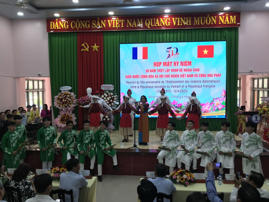 | La réunion célébrant le 50e anniversaire des relations diplomatiques entre le Vietnam et la France, tenue le 13 avril dans l’enceinte de l’université de Dông Thap. |