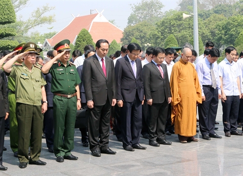 Avant la cérémonie de célébration, Trân Dai Quang, accompagné de responsables de niveau central et local, est allé fleurir et offrir de l'encens aux morts pour la Patrie dans le cimetière A1.
